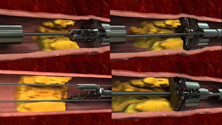 Cụ thể, cỗ máy siêu nhỏ này sẽ bám thẳng vào thành động mạch. Tại đây, thân máy hoạt động như một mũi khoan, nạo vét từng mảng mỡ và máu mắc kẹt. Sau khi kết thúc nhiệm vụ, máy sẽ được gỡ ra, máu lưu thông được bình thường.