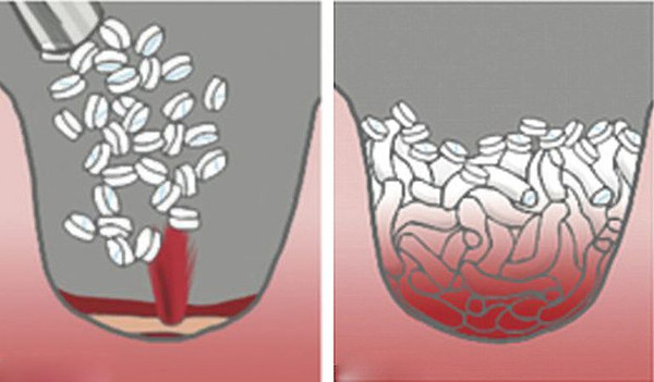 Khi tiếp xúc với dung dịch, các hạt này sẽ nở ra một cách nhanh chóng. Nếu tiêm nó vào vết thương, máu sẽ được cầm chỉ trong chưa đầy 20s.
