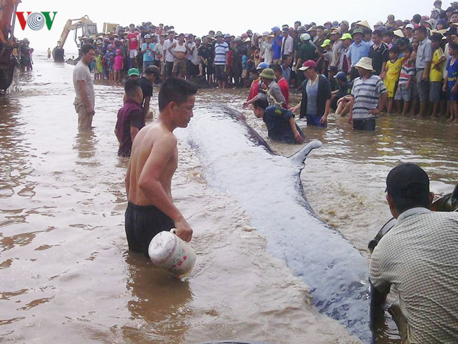 Cá voi chết, trôi dạt vào biển Nghệ An. Ảnh: VOV
