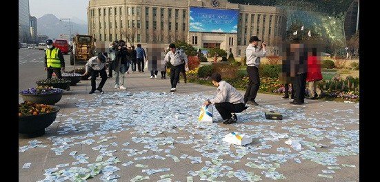 Chiều 21.3, một sự kiện được coi là chấn động dư luận đã xảy ra tại Seoul Plaza, Thủ đô Seoul - Hàn Quốc. Một người phụ nữ trung niên đã rải tiền ra khắp quảng trường, số tiền ước tính là 22 triệu won (tương đương 400 triệu VND), bà cho rằng cuộc sống và số tiền của bà đang bị đe doạ bởi chồng và con trai, chính vì thế mà bà muốn "tiêu tán" toàn bộ chúng trước khi người thân tìm cách hãm hại và cướp tài sản của bà.